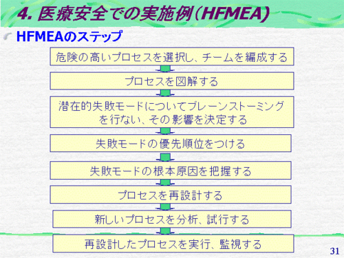 医療分野では、米国においてFMEAが1990年代から導入されているが、2000年に退役軍人局患者安全センターがその代表的モデル HFMEA を開発した。